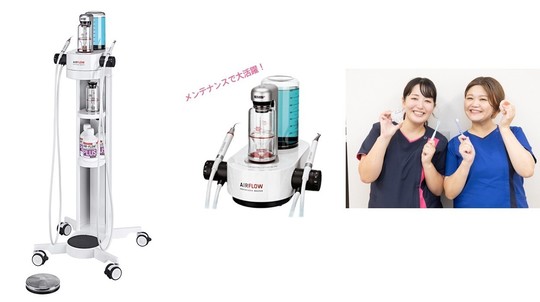 当院では新たに、EMS社が開発したエアフロー プロフィラキシス マスターを導入いたしました。当院にご来院の患者様でご希望の方には、定期メンテナンスや歯周病の治療の際にこのエアフローを用いて歯の着色、ヤニの除去などのクリーニングをいたします。