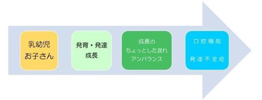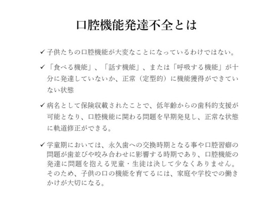 歯、歯並び、口元、べろ(舌)など顔の下半分は、口腔の健全な発達もよって通常はきれいな美しいカタチに育っていくものです。 ところが口腔顔面部の成長のアンバランスにより、子供の食べる・話す機能が十分に発達していない状態となり、「歯並びが悪い」とか「出っ歯」や「下顎が長い」などと、その人の一生涯のキャラクターにつながりかねません。 このアンバランスの過程を小児歯科学では「口腔機能発達不全症」という症状名がつくようになりました。