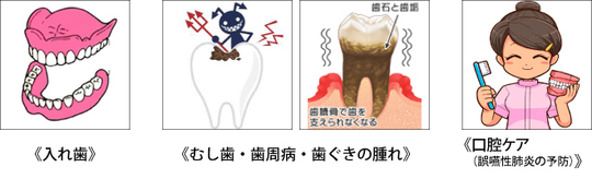 長く歯科医院へ通院できなくなると、入れ歯の調整、むし歯や歯周病など歯と歯ぐきのケアが不足しがちになります。