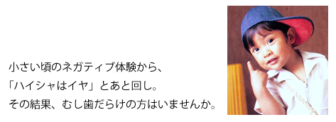 パパやママ、お兄ちゃんお姉ちゃんの治療を見たことがあるかどうか? むし歯の無い時期から、検診や予防処置で、歯医者さんに慣れることが大事です。